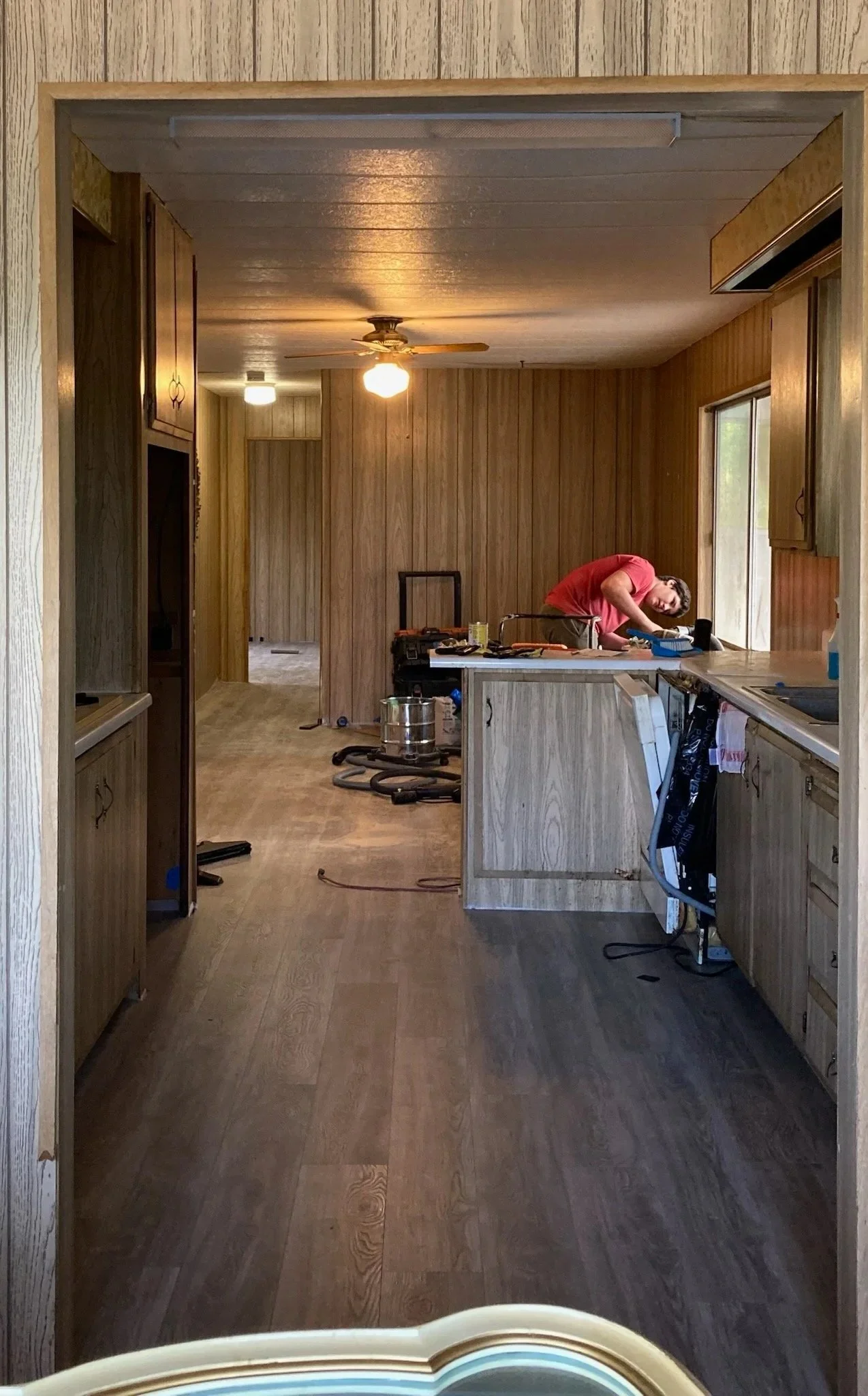 Flooring is almost complete:) Sam and a select courageous team of volunteers has helped put flooring in this past week at Carla’s mobile home. It looks amazing!! (See one picture below)