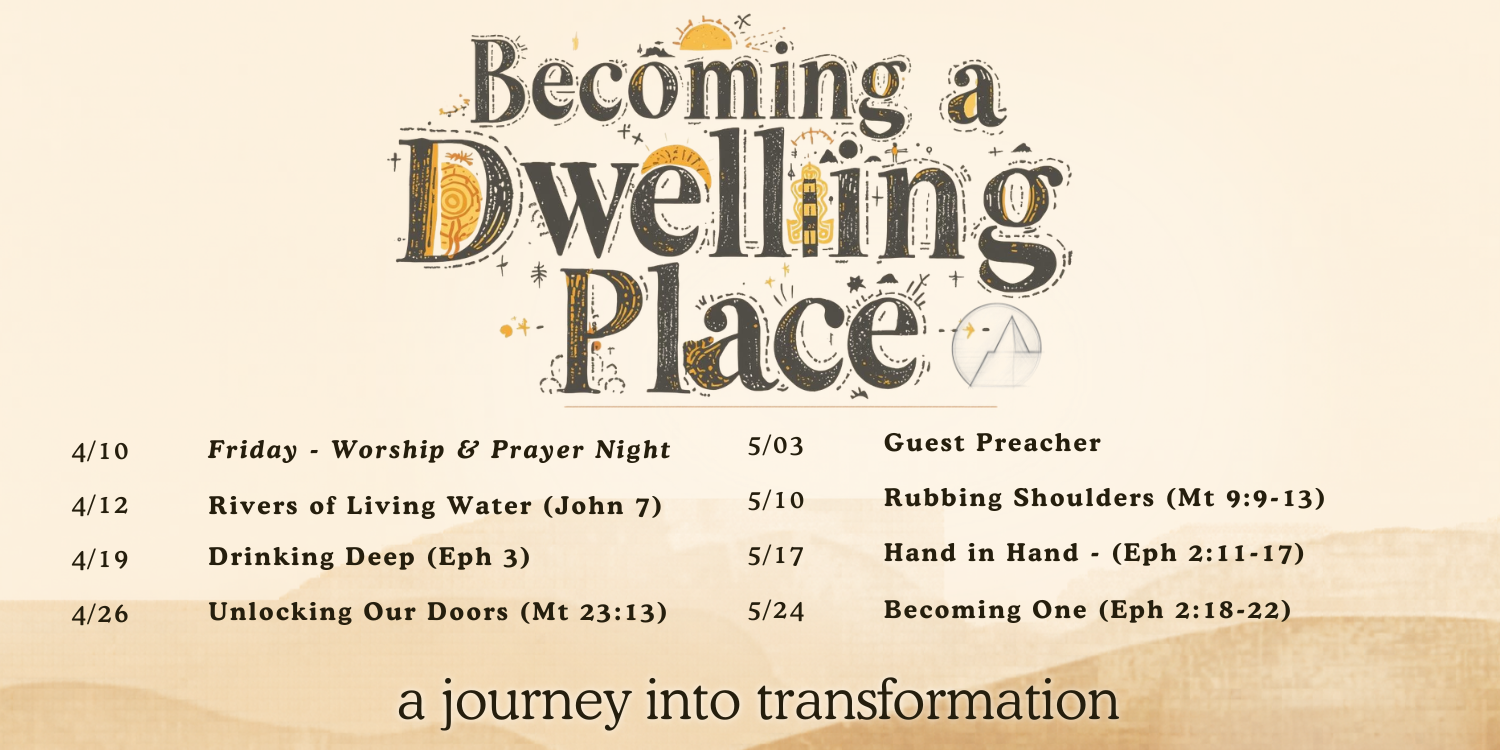 We'll study how, as we journey deeper in life with God, His presence can bring such wonderful experiences, truth-telling, and healing, that we can become people who naturally share and "leak" Jesus to the world around us. And this isn't just an individual invitation, but it's a church wide opportunity to go deeper in the Lord, to Become a Dwelling Place, so He can pour out even wider.